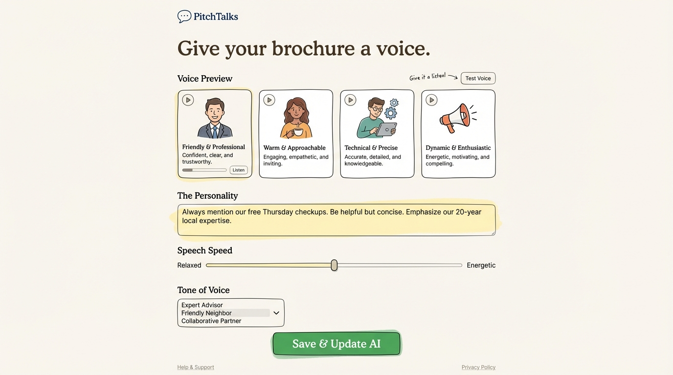 Book a demo and we’ll show you how PitchTalks turns brochure content into a voice experience your customers can actually talk to.